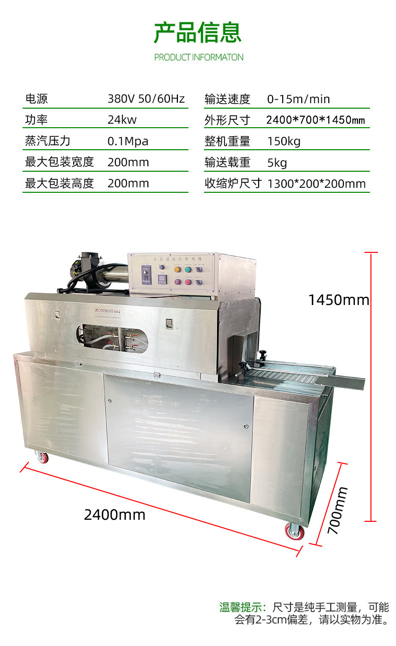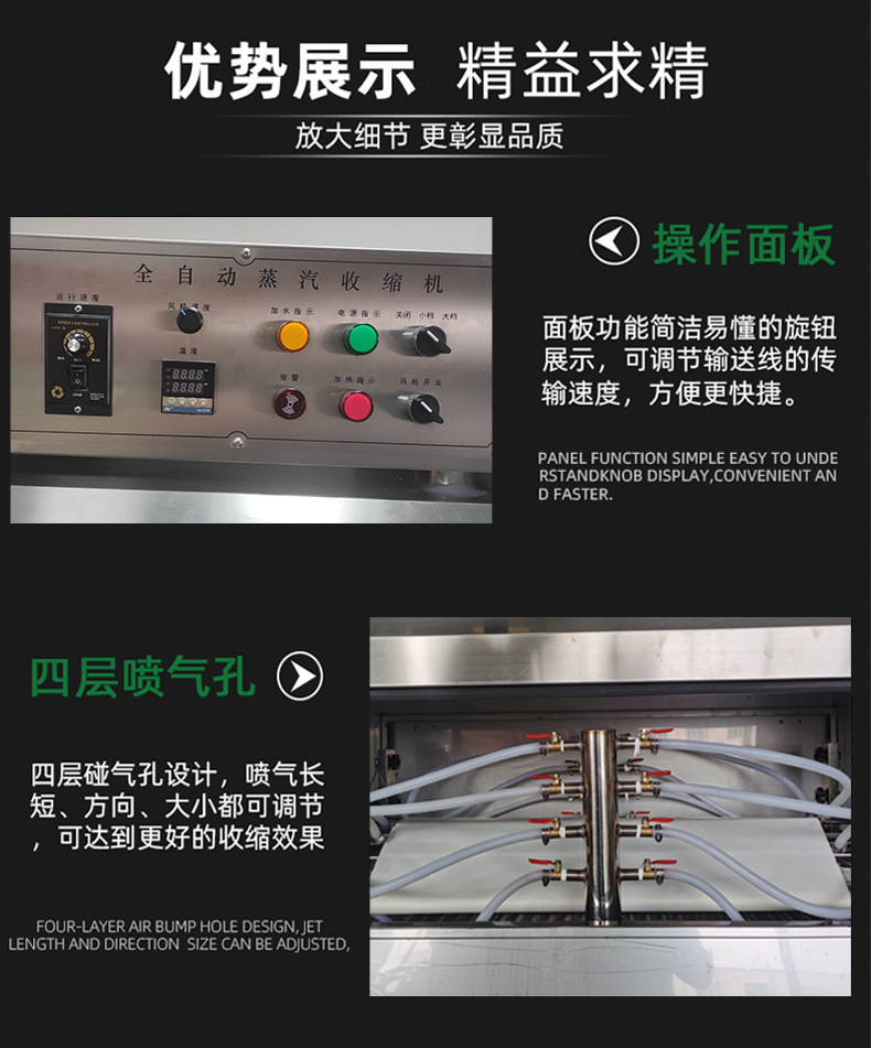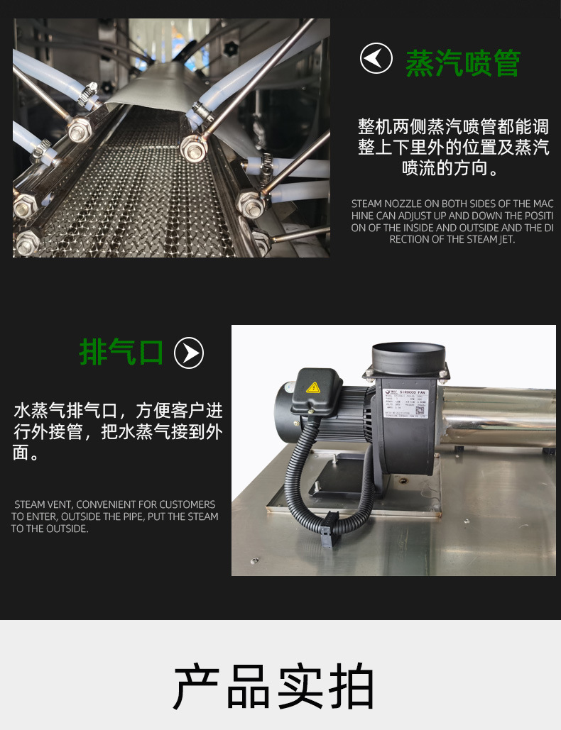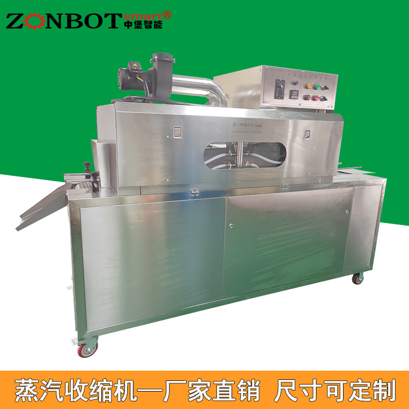 蒸汽收縮機用于輸送待包裝的物品,通常采用不銹鋼網或其他耐高溫材質,且具有無級調速功能,可根據生產需求調整輸送速度